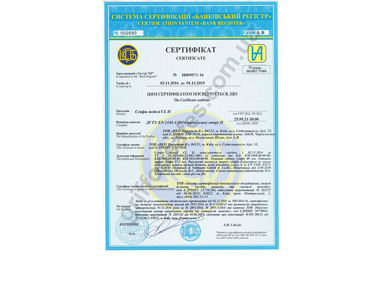 Огневзломостойкие сейфы серии СL II сертифицированы по второму классу LCNE EN 1143-1 и имеют толщину защитного слоя — 40 мм. Отвечают классу огнестойкости LFS 30P по ДСТУ EN 15659.