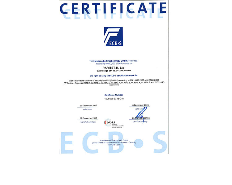 Встраиваемый взломостойкий сейф сертифицирован в Европейской лаборатории ECB-S и имеет сертификат класса S2 по стандарту EN 14450.