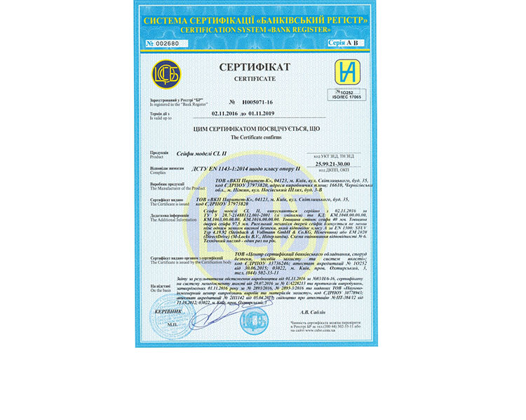 Огневзломостойкие сейфы серии СL II сертифицированы по второму классу LCNE EN 1143-1 и имеют толщину защитного слоя — 40 мм. Отвечают классу огнестойкости LFS 30P по ДСТУ EN 15659.