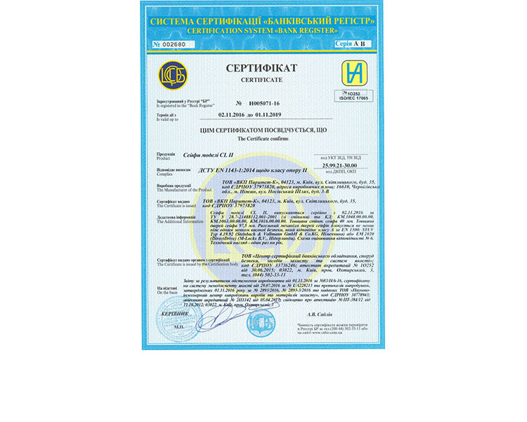 Огне-взломостойкие сейфы GRIFFON серии CL сертифицированы по второму классу ДСТУ EN 1143-1 и имеют толщину защитного слоя — 40 мм. Отвечают классу огнестойкости LFS 30P по ДСТУ EN 15659.