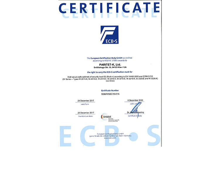 Встраиваемый взломостойкий сейф сертифицирован в Европейской лаборатории ECB-S и имеет сертификат класса S2 по стандарту EN 14450.