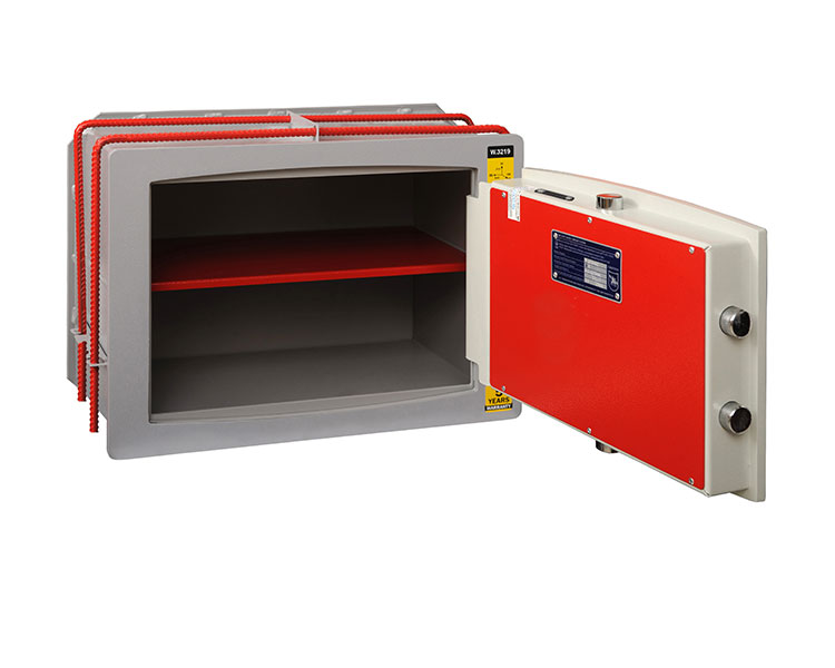 Встраиваемые сейфы серии W крепятся в стену при помощи специальной арматуры, а общая толщина их двери приравнивается к 10 мм. Сейф оснащен четырьмя надежными активными ригелями, ключевым (VDS 1) или электронным (VDS 2) замками, также имеется удобная съемная полочка.