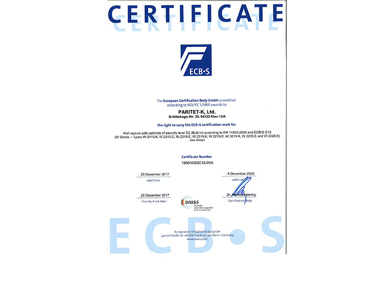 Встраиваемый взломостойкий сейф сертифицирован в Европейской лаборатории ECB-S и имеет сертификат класса S2 по стандарту EN 14450.