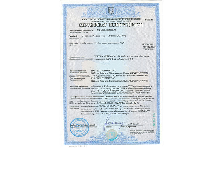 • Взломостойкость: класс S2 по EN 14450, класс S2 по ДСТУ EN 14450