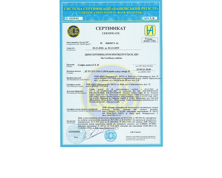 Огне-взломостойкие сейфы серии СL II сертифицированы по второму классу ДСТУ EN 1143-1 и имеют толщину защитного слоя — 40 мм. Отвечают классу огнестойкости LFS 30P по ДСТУ EN 15659.