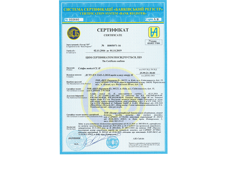 Огнев-зломостойкие сейфы серии СL II сертифицированы по второму классу ДСТУ EN 1143-1 и имеют толщину защитного слоя — 40 мм. Отвечают классу огнестойкости LFS 30P по ДСТУ EN 15659.