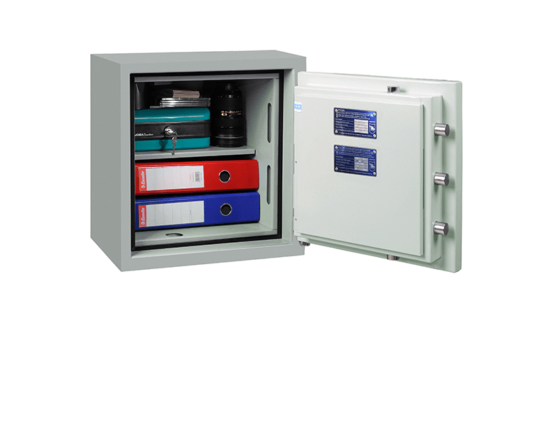 Корпус и двери огне-взломостойкого сейфа заливаются высокопрочным бетоном, а вcтроенная ригельная система отличается трехсторонней защитой, представленной кодовым замком M-LOCKS или ключевым STUV и немецкой термолентой BASF.