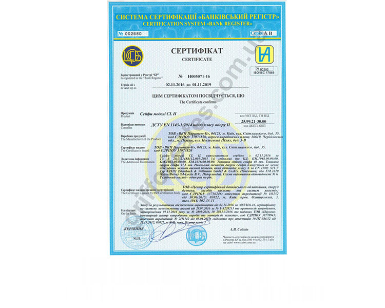 Огневзломостойкие сейфы серии СL II сертифицированы по второму классу LCNE EN 1143-1 и имеют толщину защитного слоя — 40 мм. Отвечают классу огнестойкости LFS 30P по ДСТУ EN 15659.