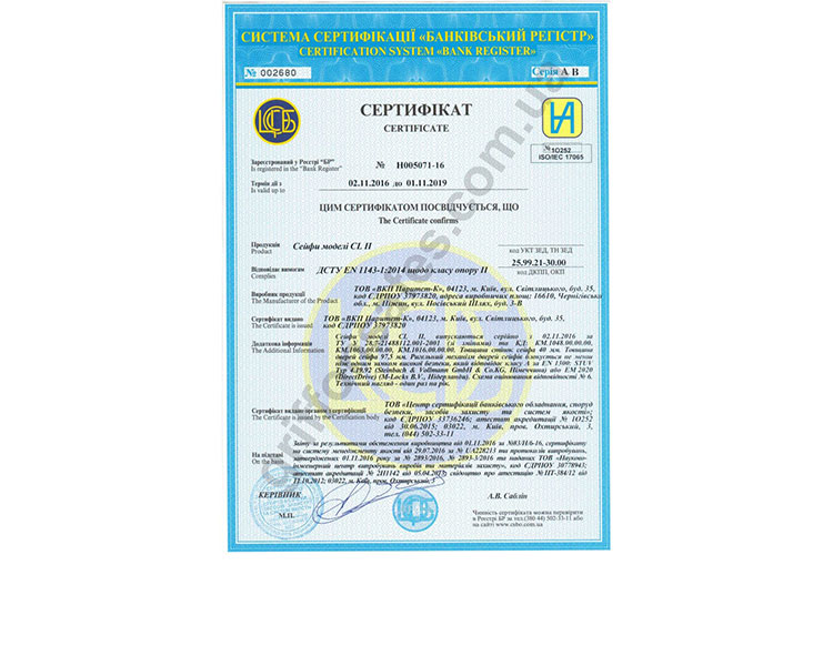 Огневзломостойкие сейфы серии СL II сертифицированы по второму классу LCNE EN 1143-1 и имеют толщину защитного слоя — 40 мм. Отвечают классу огнестойкости LFS 30P по ДСТУ EN 15659.