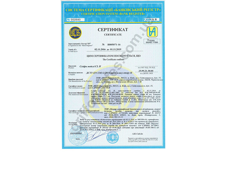 Огневзломостойкие сейфы серии СL II сертифицированы по второму классу LCNE EN 1143-1 и имеют толщину защитного слоя — 40 мм. Отвечают классу огнестойкости LFS 30P по ДСТУ EN 15659.