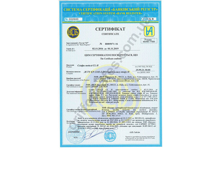 Огневзломостойкие сейфы серии СL II сертифицированы по второму классу LCNE EN 1143-1 и имеют толщину защитного слоя — 40 мм. Отвечают классу огнестойкости LFS 30P по ДСТУ EN 15659.