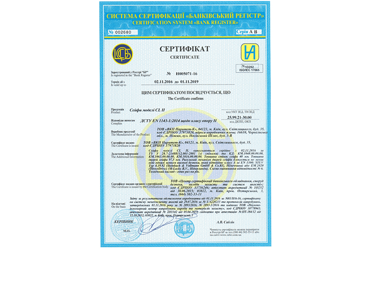Огневзломостойкие сейфы серии СL II сертифицированы по второму классу LCNE EN 1143-1 и имеют толщину защитного слоя — 40 мм. Отвечают классу огнестойкости LFS 30P по ДСТУ EN 15659.