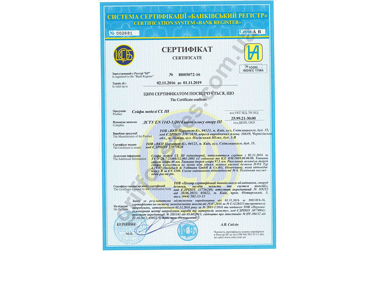 Огневзломостойкие сейфы серии СL III сертифицированы по третьему классу ДСТУ EN 1143-1 и имеют толщину защитного слоя — 40 мм. Отвечают классу огнестойкости LFS 30P по ДСТУ EN 15659.