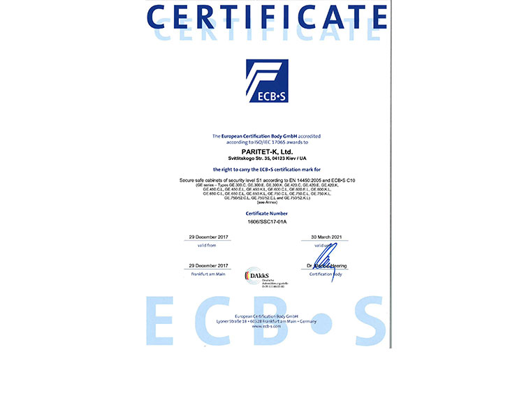 Взломостойкий сейф для оружия Европейской серии GE сертифицирован в Европейской лаборатории ECB-S и имеет сертификат класса S1 по стандарту EN 14450.