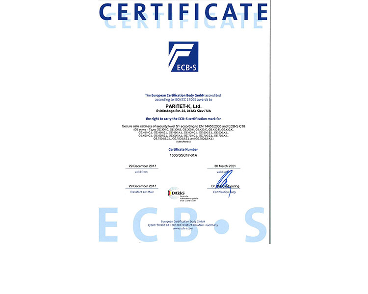 Взломостойкий сейф для оружия Европейской серии GE сертифицирован в Европейской лаборатории ECB-S и имеет сертификат класса S1 по стандарту EN 14450.