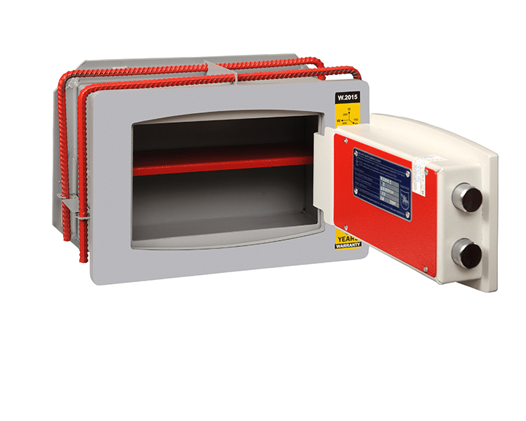 Встраиваемые сейфы серии W крепятся в стену при помощи специальной арматуры, а общая толщина их двери приравнивается к 10 мм. Сейф оснащен четырьмя надежными активными ригелями, ключевым (VDS 1) или электронным (VDS 2) замками, также имеется удобная съемная полочка.