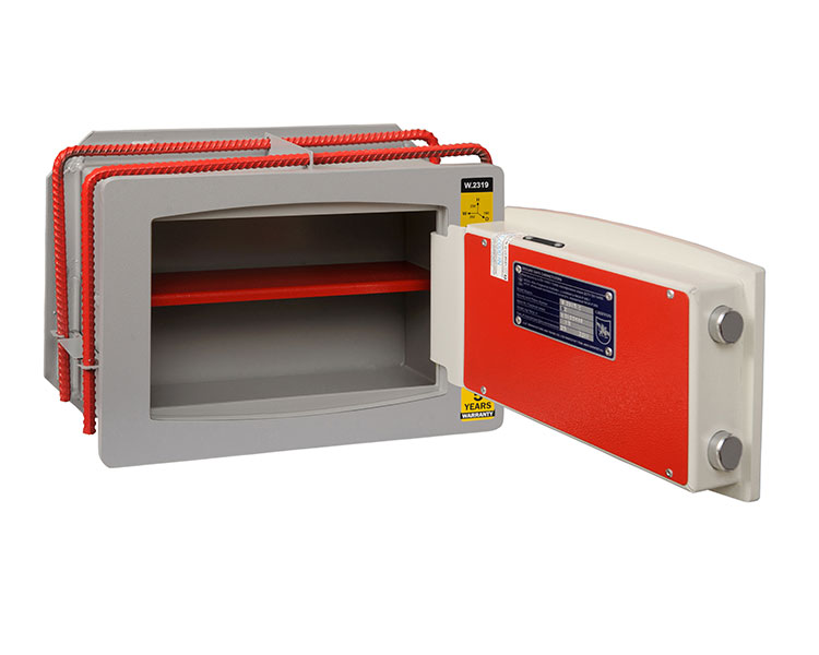 Встраиваемые сейфы серии W крепятся в стену при помощи специальной арматуры, а общая толщина их двери приравнивается к 10 мм. Сейф оснащен четырьмя надежными активными ригелями, ключевым (VDS 1) или электронным (VDS 2) замками, также имеется удобная съемная полочка.
