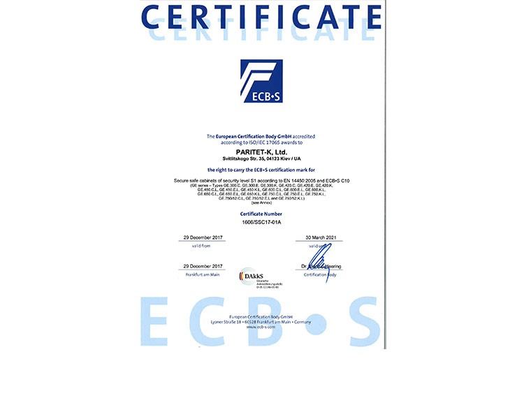 Взломостойкий сейф для оружия Европейской серии GE сертифицирован в Европейской лаборатории ECB-S и имеет сертификат класса S1 по стандарту EN 14450.