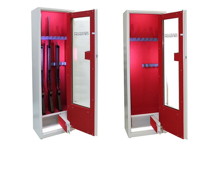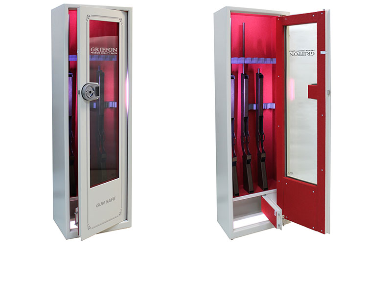 Серия GRIFFON GG Premium стала гармоничным способом совмещения широкой функциональности и изысканного дизайна: корпус сейфа изготавливается из металла 6 мм, а его двери оборудованы бронированным 20-тимиллиметровым стеклом, что разрешает беспрепятственный обзор оружия, находящегося в сейфе. Внутри сейф оснащен специальным отделением для патронов и подсветкой. Имеет оригинальный кремовый цвет покраски.