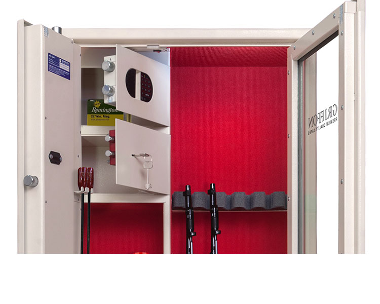 Серия GRIFFON GG Premium стала гармоничным способом совмещения широкой функциональности и изысканного дизайна: корпус сейфа изготавливается из металла 6 мм, а его двери оборудованы бронированным 25-тимиллиметровым стеклом, что разрешает беспрепятственный обзор оружия, находящегося в сейфе. Внутри сейф оснащен специальным отделением для патронов и подсветкой. Имеет оригинальный кремовый цвет покраски.