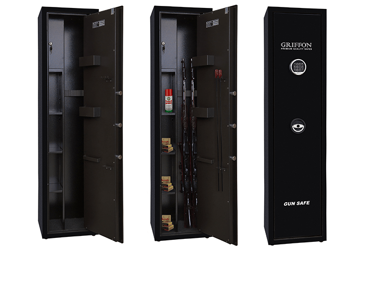 Сейф серии GS для хранения оружия имеет антивзломную конструкцию дверей (зацеп), петлю-антисрез, вертикальный трейзер (кассу) увеличенной емкости с полкой для хранения патронов и три съёмные полки для оружейных аксессуаров или документов, карманы для размещения средств по уходу за оружием или магазинов, держатели и фиксатор под шомполы, планку для навески. Сейф укомплектован передвижным магнитным ложементом.