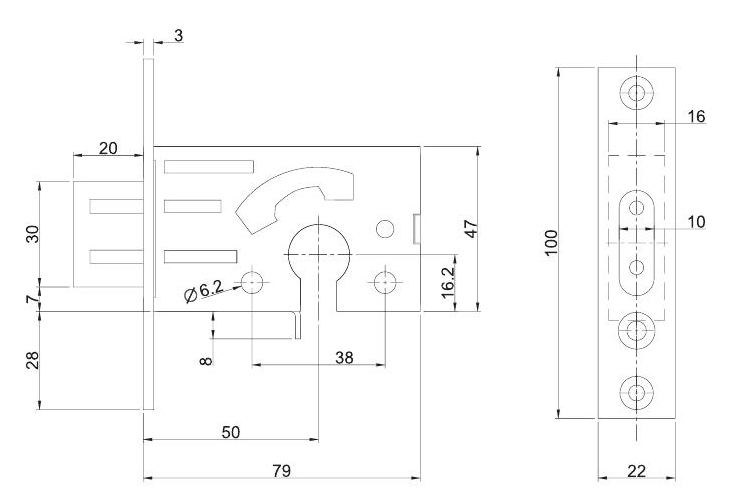 Корпус замка: ширина 79 мм, высота 47 мм, толщина 16 мм;