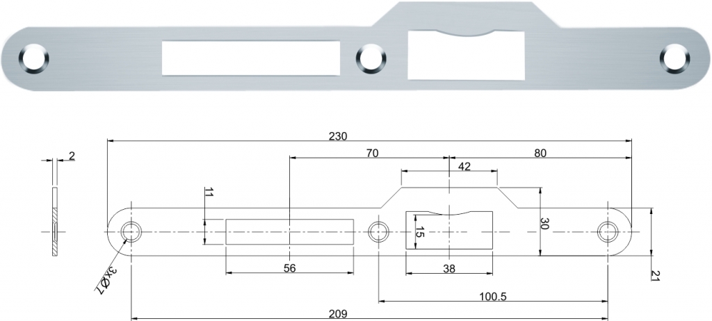 Лицевая планка: ширина 20 мм, длина 220 мм, толщина 2,5 мм;
